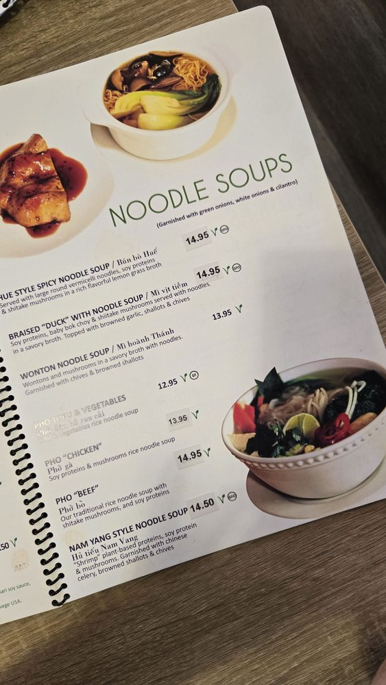 Soy proteins, baby bok they & shiitakc mushrooms served with noodles in a savory broth. Topped with browned garlic, shallots & chives